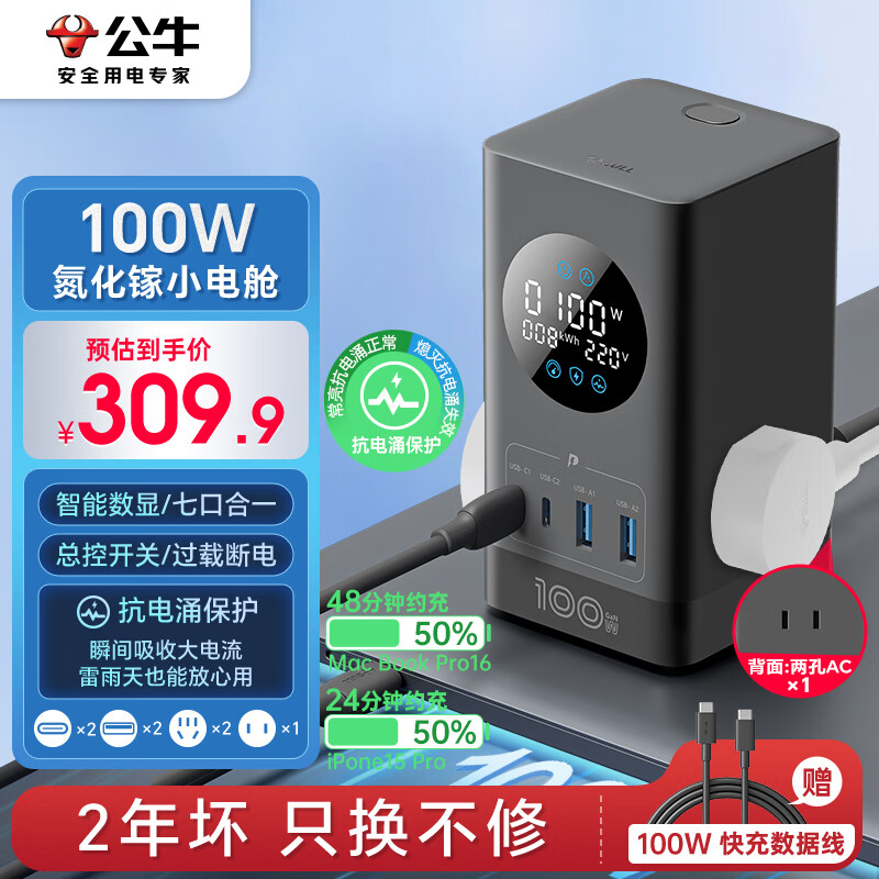 公牛(BULL)智能数显屏幕氮化镓100W快充插座/抗电涌桌面插座3C认证 适用iphone17立式USB 总控开关2C2A+3插孔