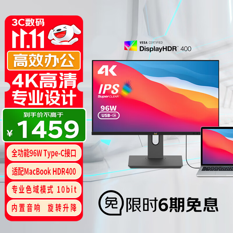优派27英寸 4K超清 IPS显示器 HDR400 TypeC96W 10bit 旋转升降 广色域 专业设计电脑显示屏 VG2781-4K
