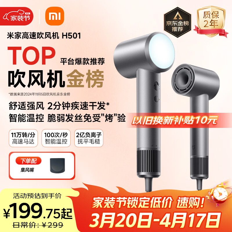 米家高速吹风机H501 家用小米吹风机智能温控速干恒温负离子吹风筒静音护发 送女友生日礼物配风嘴
