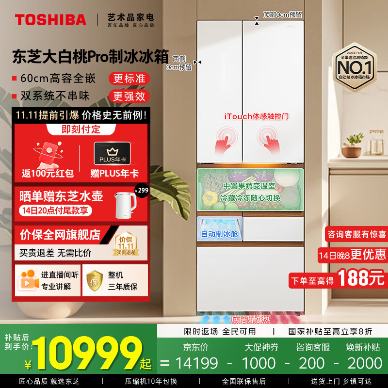 东芝(TOSHIBA)大白桃Pro483高容全嵌入式超薄日式多门双系统节能风冷无霜家用制冰冰箱国家补贴GR-RM483WI-PG1B3