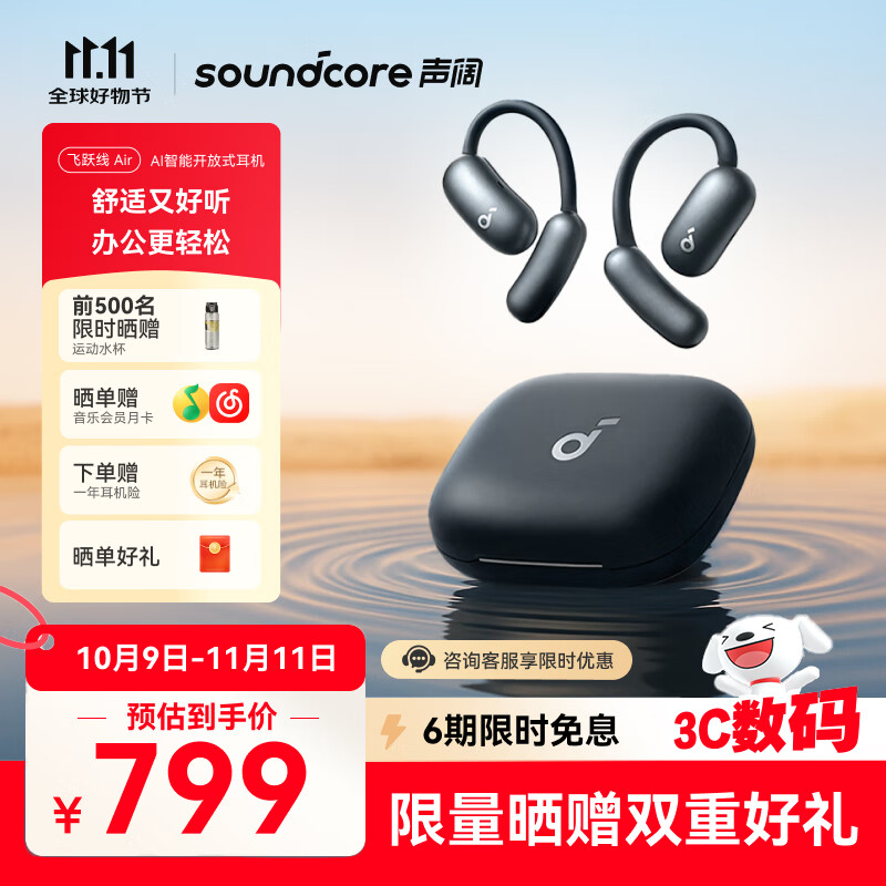 声阔(SoundCore)飞跃线Air开放式耳机挂耳式AI智能翻译不入耳无线蓝牙运动跑步适用苹果华为小米黑色