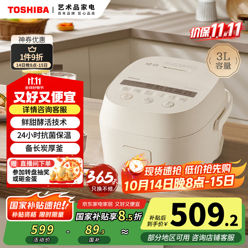 东芝(TOSHIBA)健康酵活三维全域加热电饭煲2-3人 3L智能米量判定 备长炭 鲜米煲系列RC-10DHUC(WY)