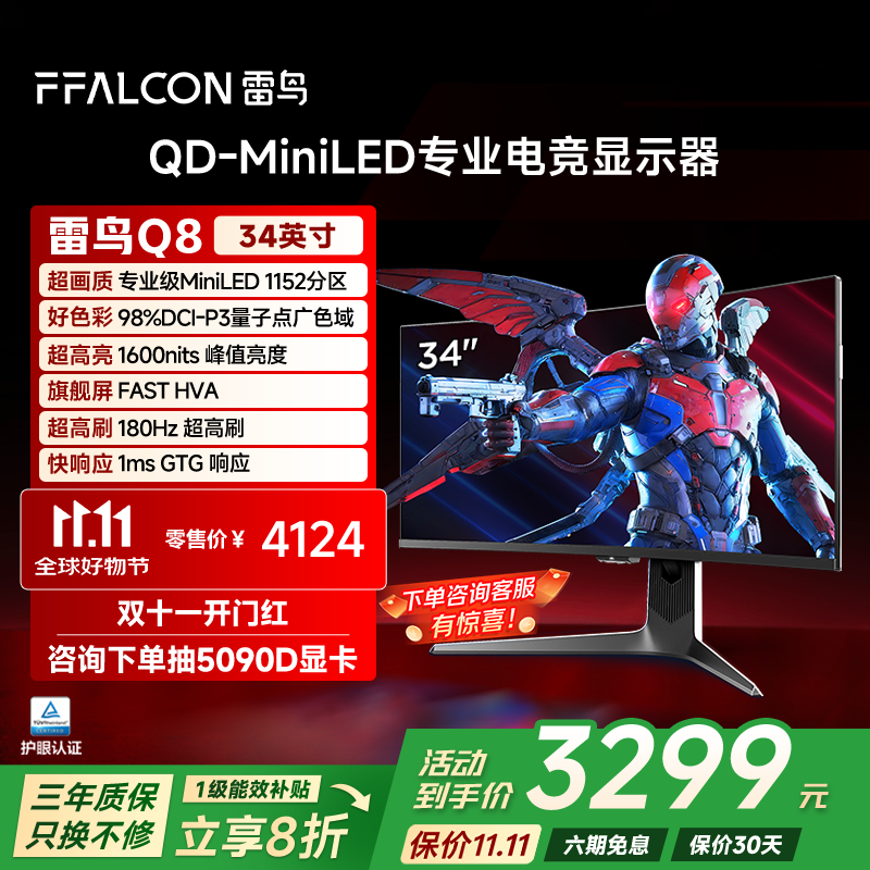 FFALCON雷鸟Q8 34英寸准4K180Hz 2304灯珠QD-MiniLED高刷电竞显示器 曲面带鱼屏TypeC90W双音响办公电脑显示屏