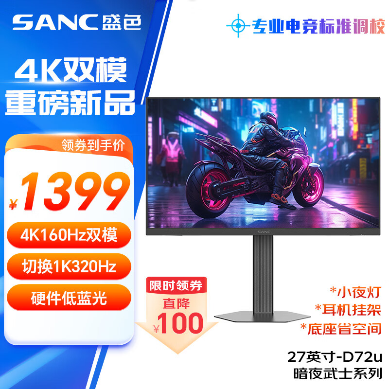 SANC盛色27英寸4K160Hz双模1K320Hz显示器FastIPS 硬件低蓝光 HDR旋转升降电竞电脑屏幕 D72u
