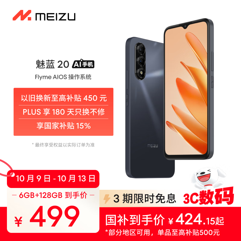 魅族(MEIZU)魅蓝 20 AI手机 5010mAh轻薄长续航 5000万主摄 Flyme AIOS系统 6GB+128GB 曜石黑 享国补15%