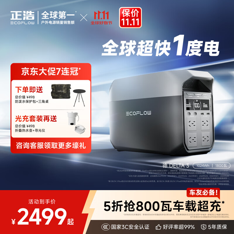 ECOFLOW正浩【超快1度电1800W大功率】德3快充户外移动电源220V大容量便携自驾露营车载应急备用储能电池