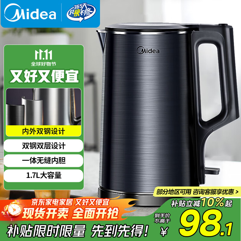美的(Midea)烧水壶电热水壶双层防烫全钢食品级304一体无缝内胆电热水壶家用1.7L大容量SH17X2-301