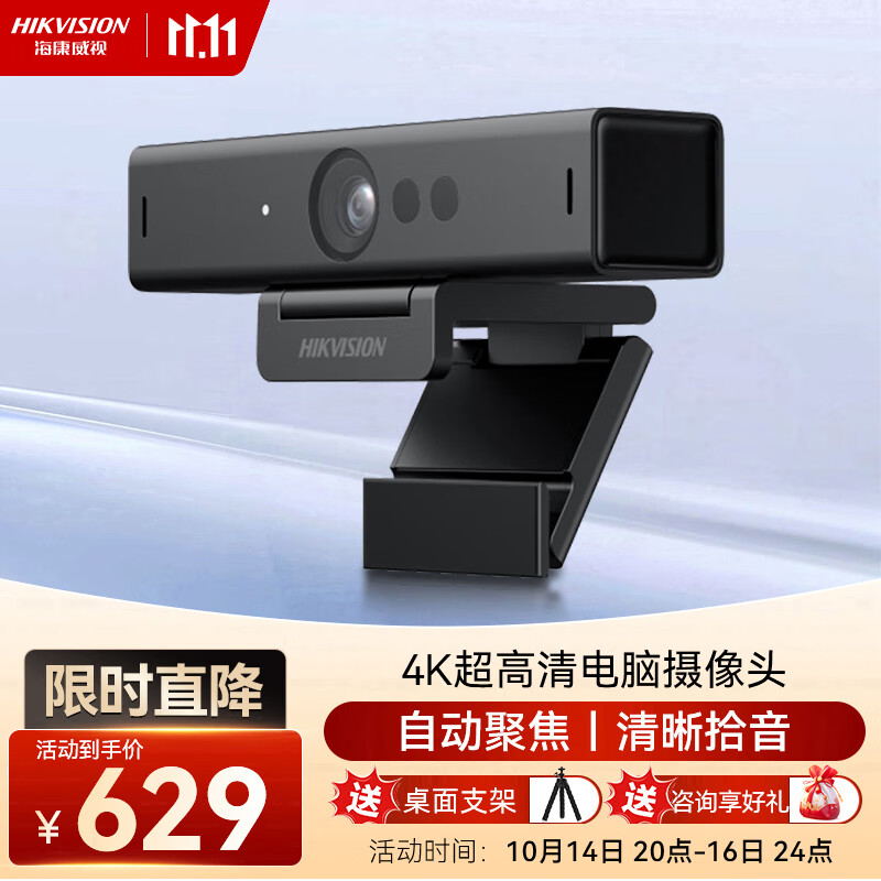 HIKVISION海康威视电脑摄像头直播800万4K超高清带麦克风USB免驱网课家用视频会议直播带货DS-U68
