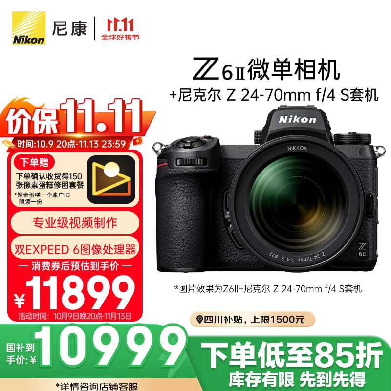 尼康(Nikon)【价保11.11】Z6II(Z6 2/Z62)全画幅微单相机套机(24-70mm f/4 S微单镜头 约2,450万有效像素)