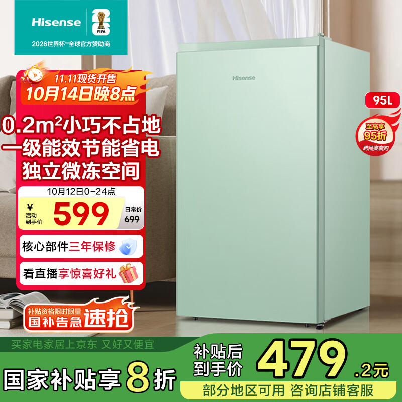 海信(Hisense)95升小型冰柜家用立式冰柜冷藏柜办公室冰吧厅吧 一级能效出租房酒店小型冰箱 复古罗马绿 BC-95BQ