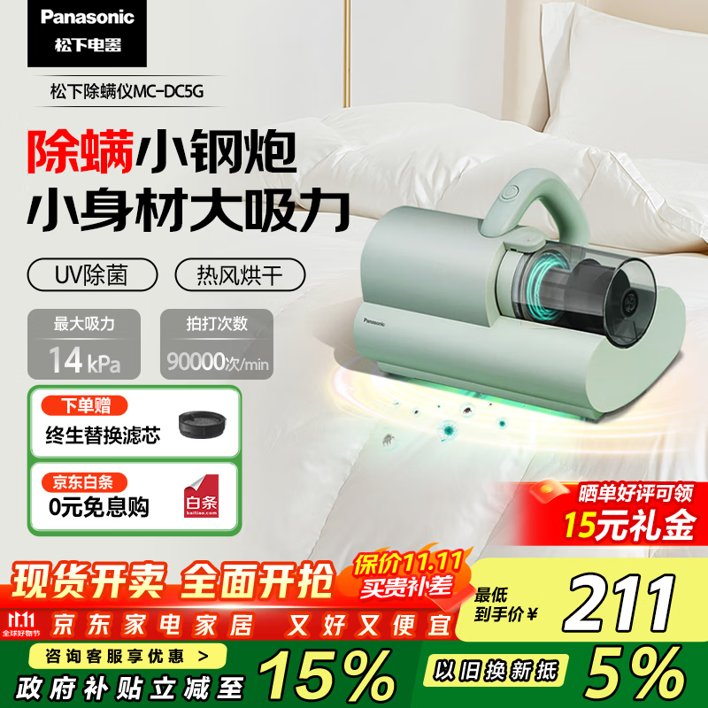 松下(Panasonic)【国家补贴】除螨仪床宝 猫狗吸毛除毛除螨紫外线杀菌除湿 双电机小体型大吸力 团购礼品 MC-DC5G