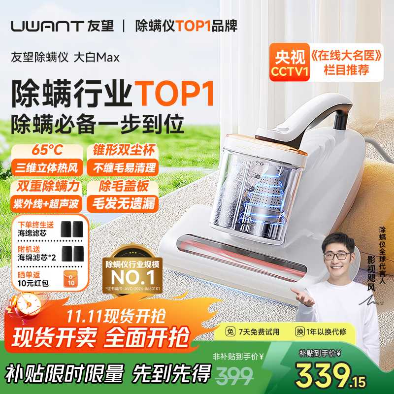 uwant友望除螨仪cm2306大白max【CCTV1推荐】吸尘除螨一体机双杯尘螨分离65℃高温杀菌家用床上吸尘器