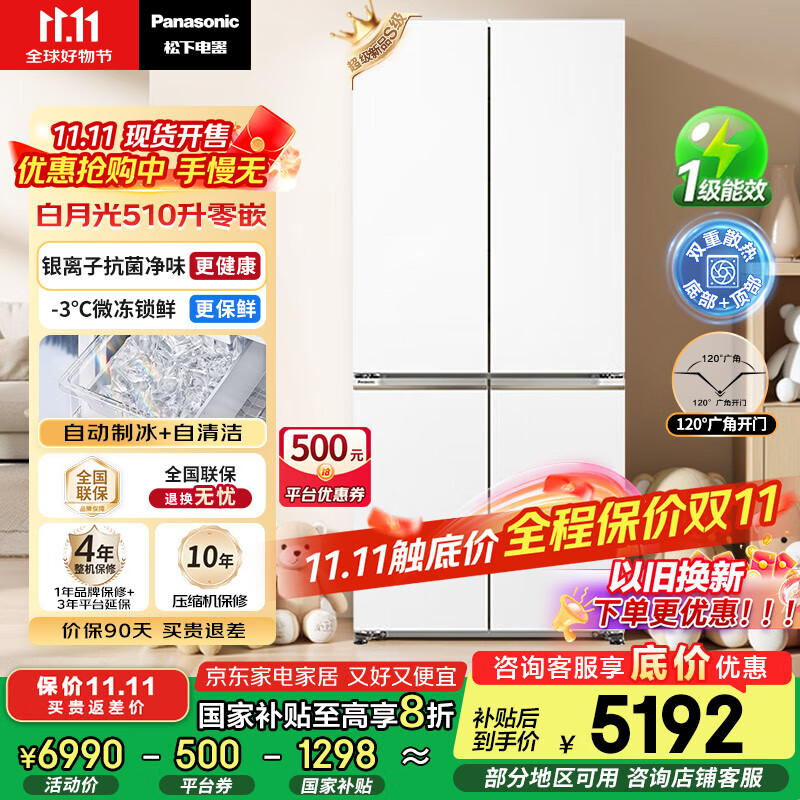 松下(Panasonic)【国家补贴20%】白月光家用冰箱十字门510超薄零嵌入双开四门电冰箱风冷无霜一级能效NR-ED51CSA-W