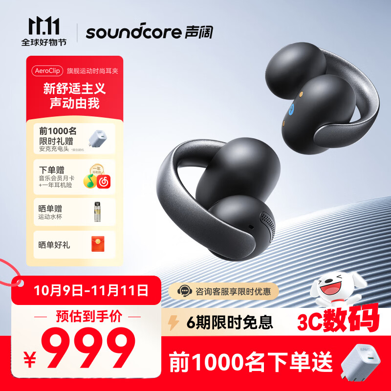 声阔(SoundCore)【国家补贴】AeroClip耳夹式蓝牙耳机无线开放式运动跑步耳机气传导耳机不入耳适用苹果华为小米黑