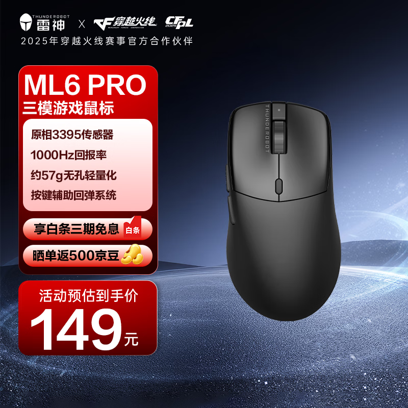 雷神(ThundeRobot)ML6PRO轻量化无线鼠标游戏电竞办公家用有线/2.4G/蓝牙三模 PAW3395人体工学无孔设计无畏契约黑色