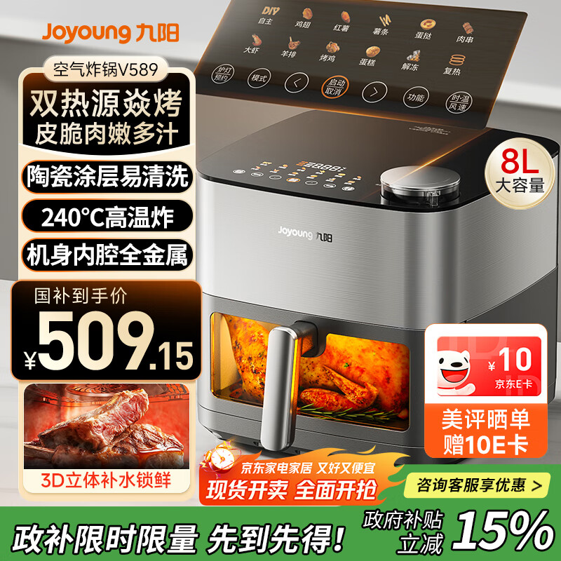 九阳(Joyoung)炎烤不用翻面空气炸锅焱烤8L机身内腔全金属3D立体补水仓无油低脂KL80-V589