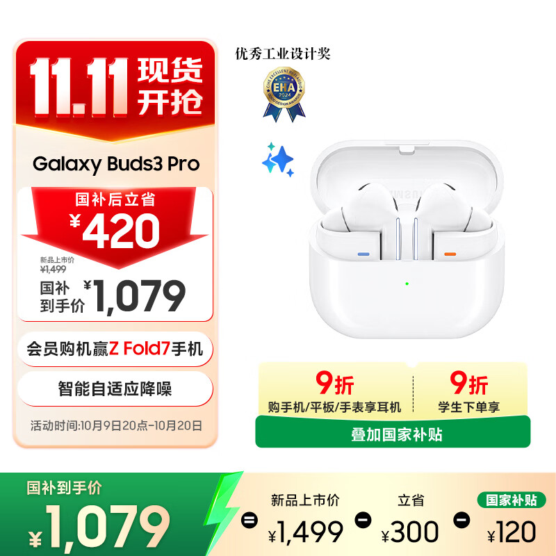 三星 Samsung【国家补贴】Buds3 Pro 自适应主动降噪无线蓝牙耳机/游戏运动耳机/AI同传翻译 流沙白