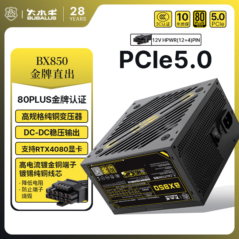 大水牛(BUBALUS)额定850W 金牌BX850台式电源(原生PCIE5.0/ATX3/支持4080显卡/宽幅/4显卡供电接口/全台系电容)