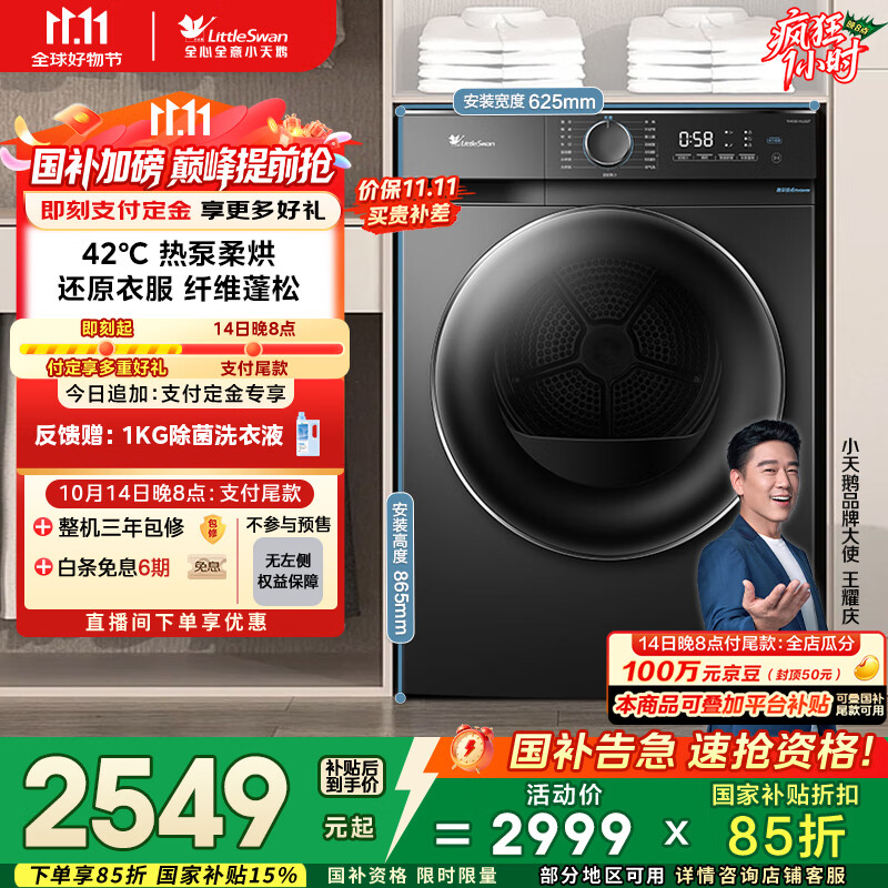小天鹅(LittleSwan)10KG热泵烘干机 家用干衣机烘衣服 AI正反转 祛味除螨除潮 回南天烘干机 超薄TH100-HL02T国家补贴