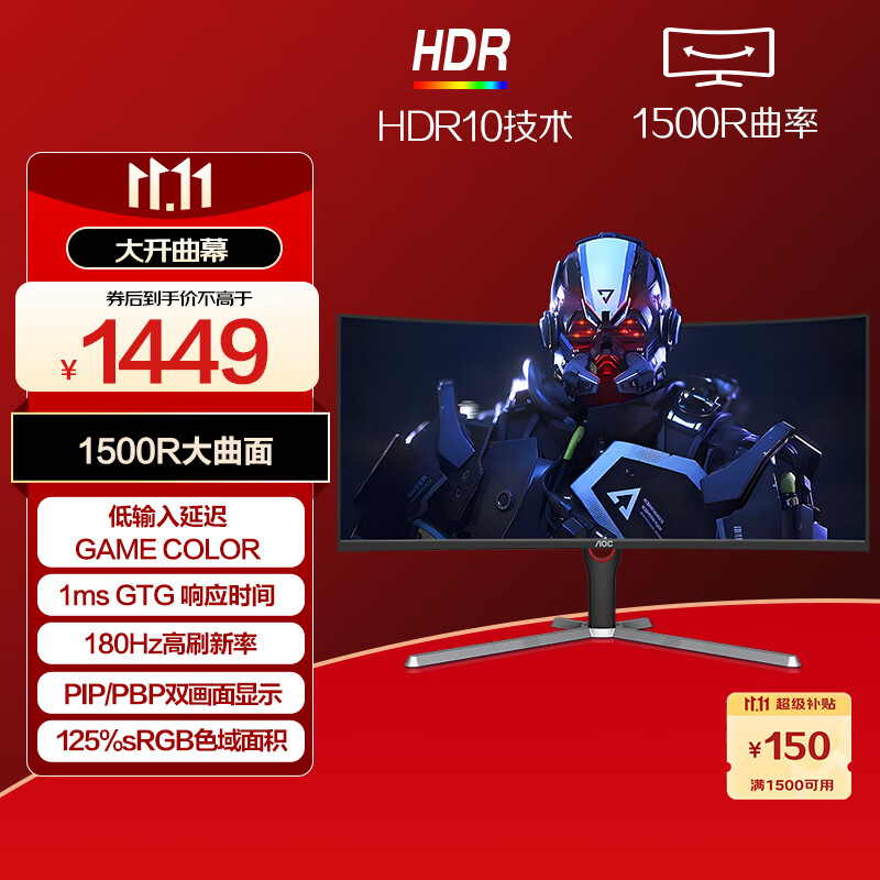 AOC 34英寸 带鱼屏 WQHD 广色域 180Hz HDR10 出厂校色 旋转升降 21:9曲面电竞电脑显示器 CU34G3X