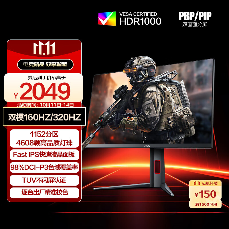 AOC 27英寸1152分区QD-MiniLED 4K 160Hz双模FHD 320Hz HDR1000 1ms 游戏电竞电脑显示器 逐光U27G4XM