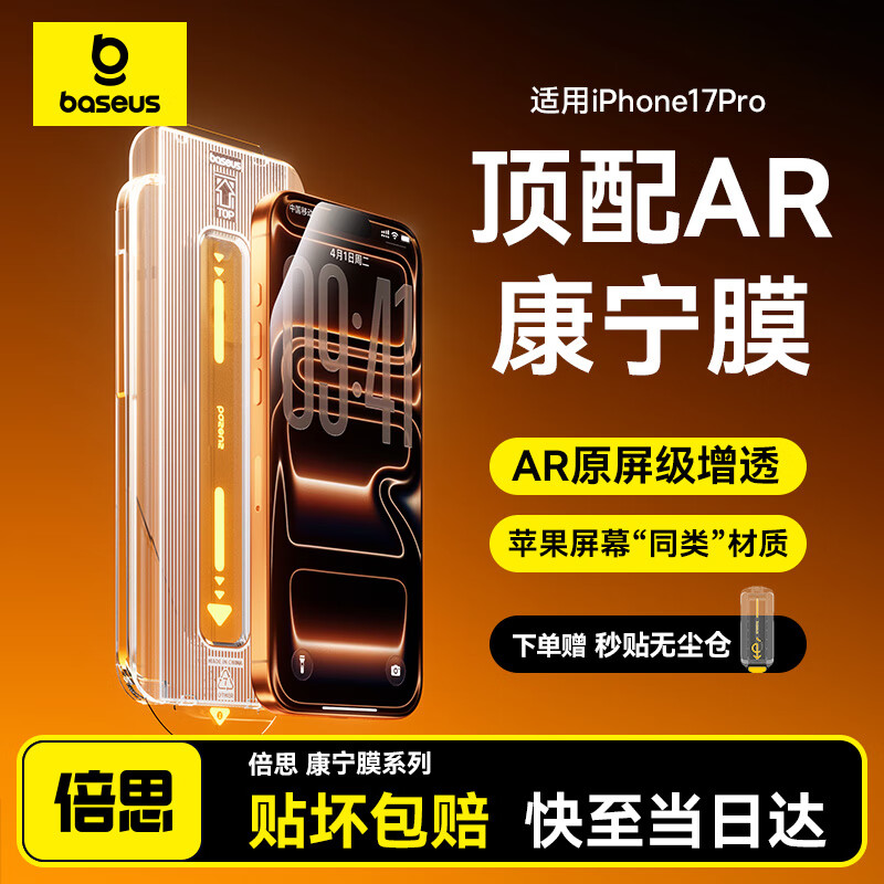 倍思【真AR康宁玻璃丨无尘仓秒贴】适用iPhone17Promax钢化膜苹果17promax手机膜康宁膜全覆盖防摔指纹
