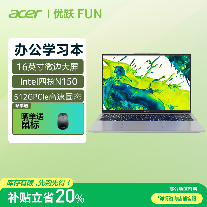 宏碁(Acer)优跃FUN笔记本电脑 16英寸商务办公学习轻薄本 N150 8G 512GSSD 全高清