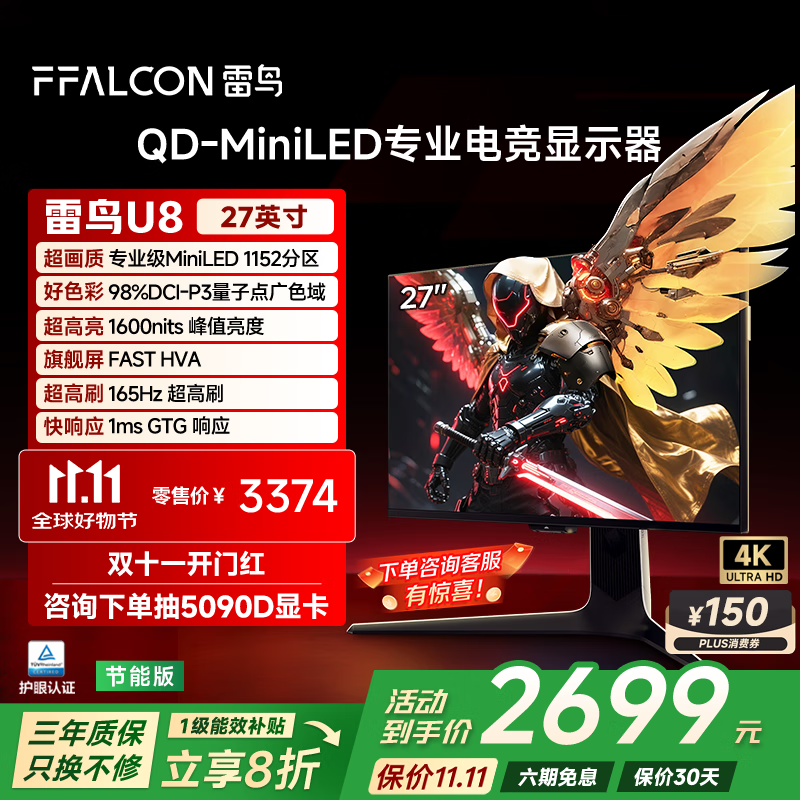 FFALCON雷鸟U8 25款 27英寸4K165Hz 1152分区QD-MiniLED电竞显示器 双音响 Type-C 90W HDR1400办公电脑显示屏