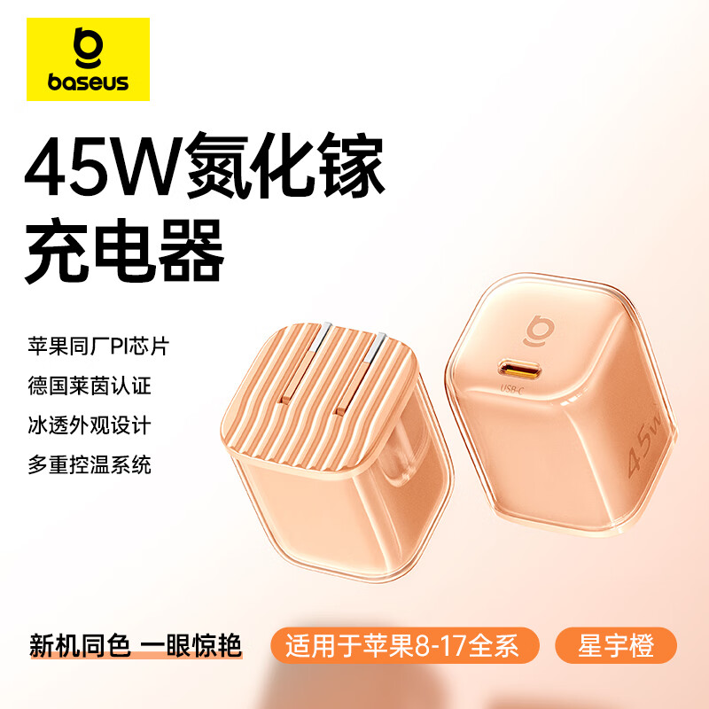 倍思同芯充Pro【苹果17ProMax首选】氮化镓充电器pd45W/40W快充头iPhone17/16/Air手机ipad充电 星宇橙
