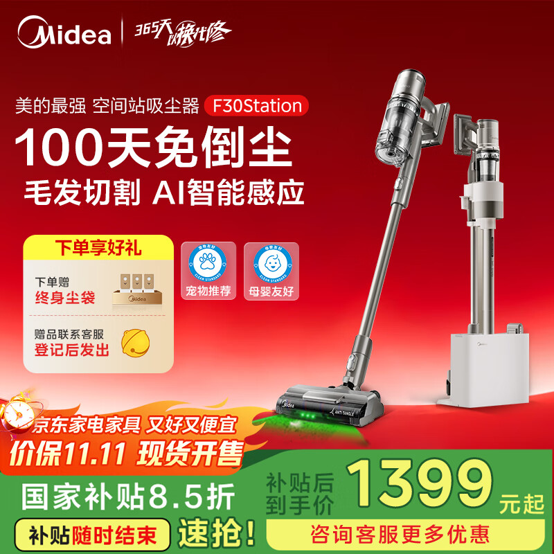 美的(Midea)吸尘器家用无线手持ai自集尘空间站F30station除螨绿光宠物【100天不倒尘 毛发防缠】【国家补贴】