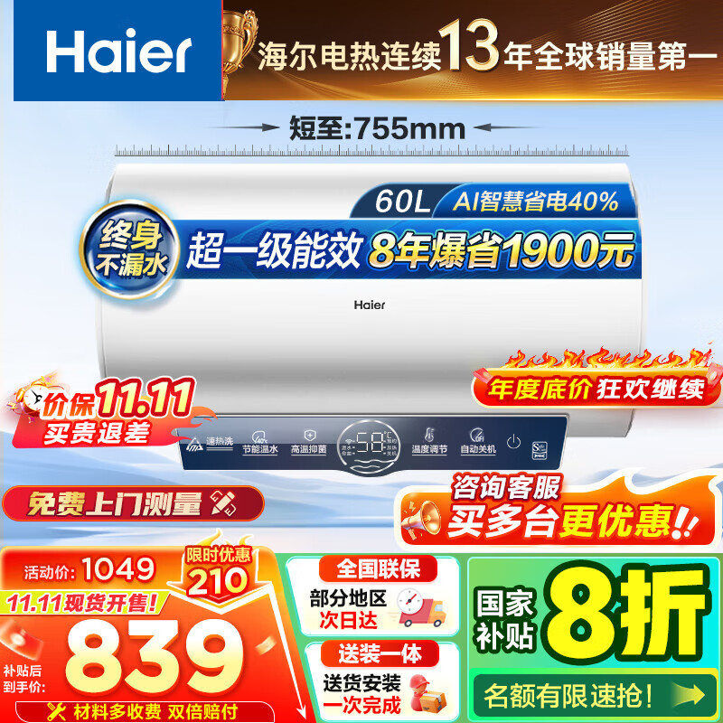 海尔(Haier)【咨询客服领补贴】热水器电热水器60升ME3一级能效家用储水式 金刚无缝胆速热镁棒免更换WIFI智联 60L 2200W 80%客户首选ME3行业第一