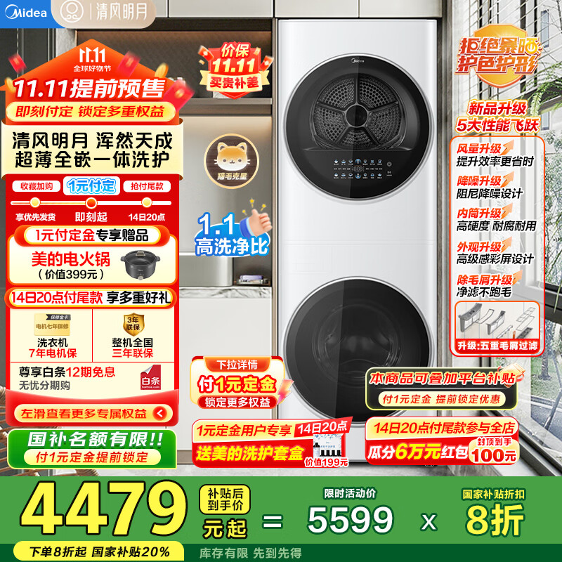 美的(Midea)洗烘套装 10KG全自动滚筒洗衣机+10公斤热泵烘干机【清风明月】洗烘护一体机MGH20VE5PRO 国家补贴20% MGH20VE5PRO