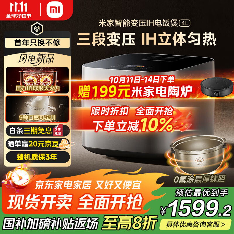 米家小米电饭煲0氟涂层钛内胆不粘4L家用4-5人 IH变压3D加热 14分钟快煮 智能APP多功能煮饭锅煮粥锅