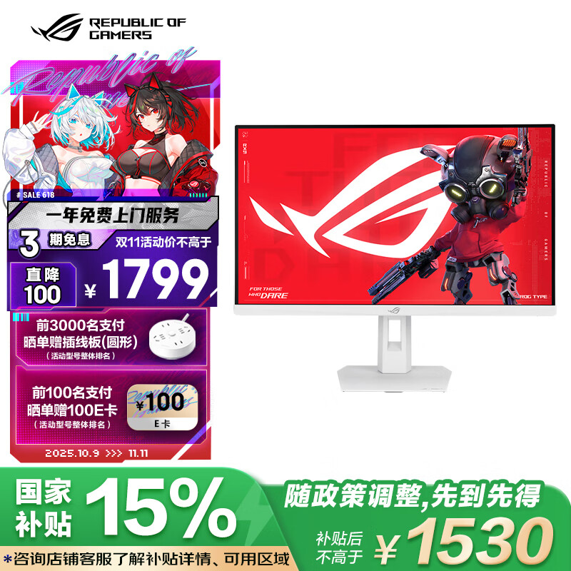 华硕(ASUS)ROG XG27ACMES-W 27英寸显示器2K240Hz电竞显示器超频255Hz HDR400 G-Sync 0.3ms响应 HDMI 2.1