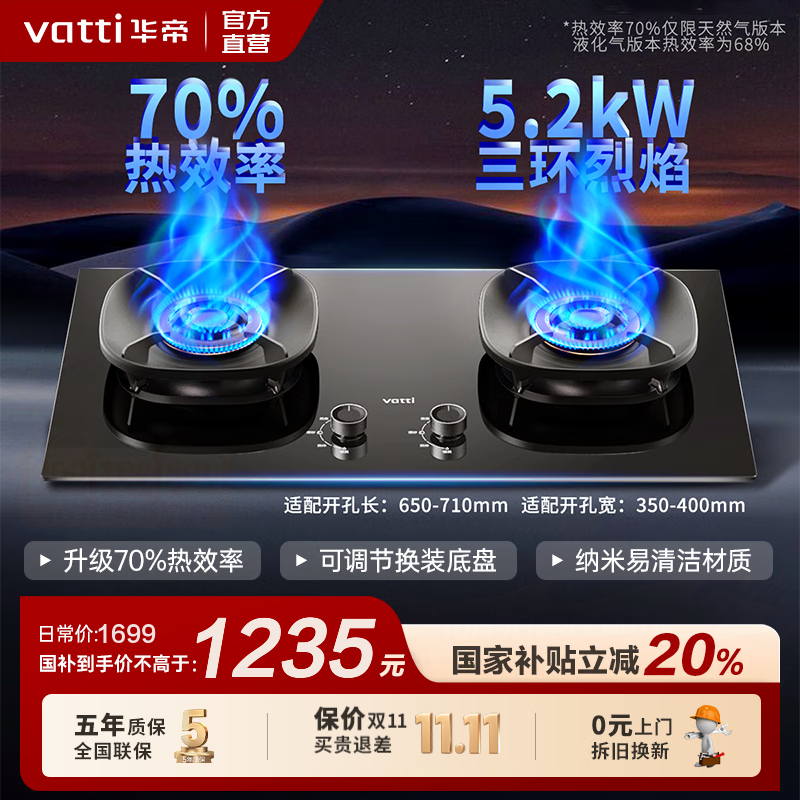 华帝(VATTI)燃气灶【省气大师】国家补贴20%灶具天然气小飞翼小飞碟Max嵌入式台式两用双灶5.2kW猛火一级能效 【爆款】i10309 升级款70%高热效 天然气5.2kW