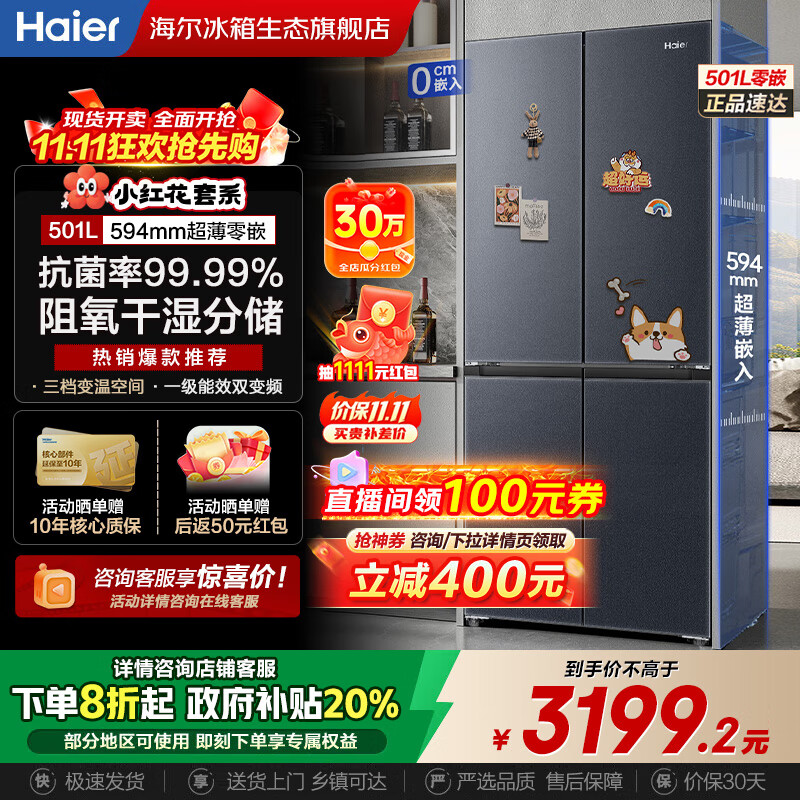 海尔(Haier)超薄冰箱594mm零嵌入501升四开门一级能效变频风冷无霜大容量T型双开门四门家用 594mm超薄零嵌丨干湿分储丨净化除菌 501升
