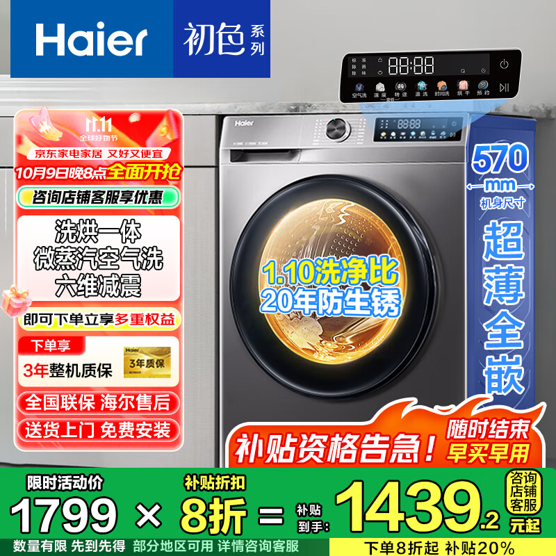 海尔(Haier)滚筒洗衣机全自动10公斤洗烘一体机 懒人超薄家用 家电国家补贴20% 以旧换新 EG100HMAX29S