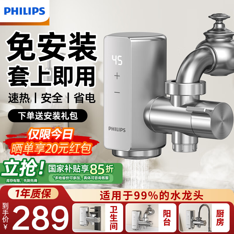 飞利浦Philips-AWH1156SL/93电热水龙头苏即热式泊变频恒温尔免安装接驳小型家用卫生间厨房速热热水器 变频款+漏保