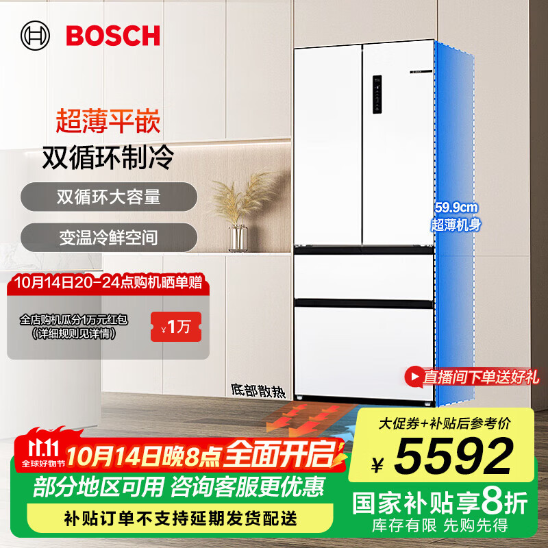 博世(BOSCH)冰箱【59.9cm超薄平嵌】501L法式四开门多门家用变频电冰箱 双循环大容量 清风净味 支持国家补贴 白色KME50A20TI