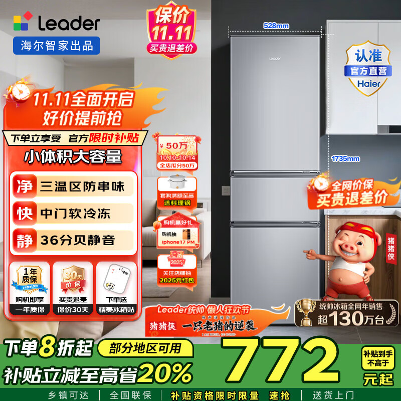 统帅(Leader)海尔冰箱出品小三门218升小型迷你家用超薄节能电冰箱宿舍租房家用不占地防串味BCD-218LLC3E0C9 BCD-218LLC3EZS9二级能效