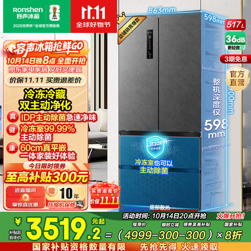 容声517升双净法式多门四开门超薄零嵌入式电冰箱家用一级能效风冷无霜节能BCD-517WD2MPQLA灰国家补贴 国家补贴20%