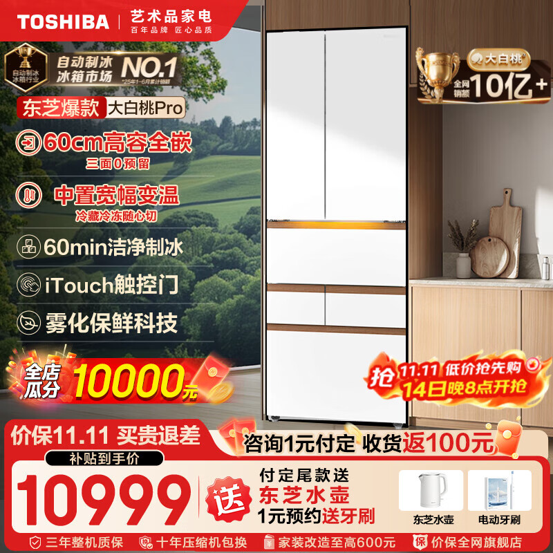 东芝(TOSHIBA)483【大白桃Pro系列】超薄零嵌入自动制冰双系统除菌净味一级能效多门双开门国家补贴家用电冰箱 GR-RM483WI-PG1B3