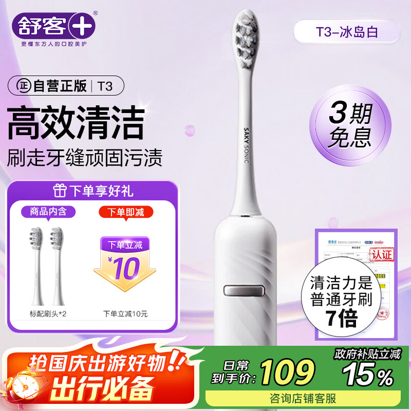 舒客 情侣电动牙刷成人/学生送男友/女友软毛护龈声波5档 情人节生日礼物 国家补贴 T3白 牙刷