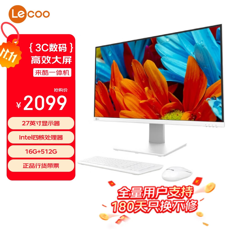 联想(Lenovo)来酷 Lecoo一体台式机电脑27英寸(英特尔N95 16G内存 512G固态高速硬盘 无线键鼠) 白