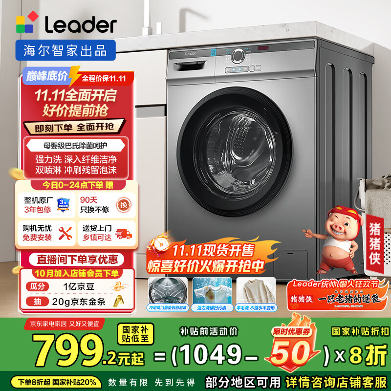 统帅(Leader)海尔智家滚筒洗衣机全自动家用10公斤超薄 一级能效 家电国家补贴 TQG100-B29S