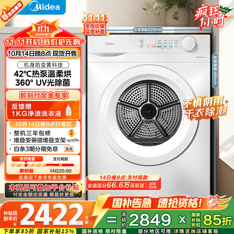 美的(Midea)10公斤热泵烘干机 干衣机家用烘衣服 除螨除潮 多重毛屑过滤 紫外线除菌 MH100V11F 家电国家补贴