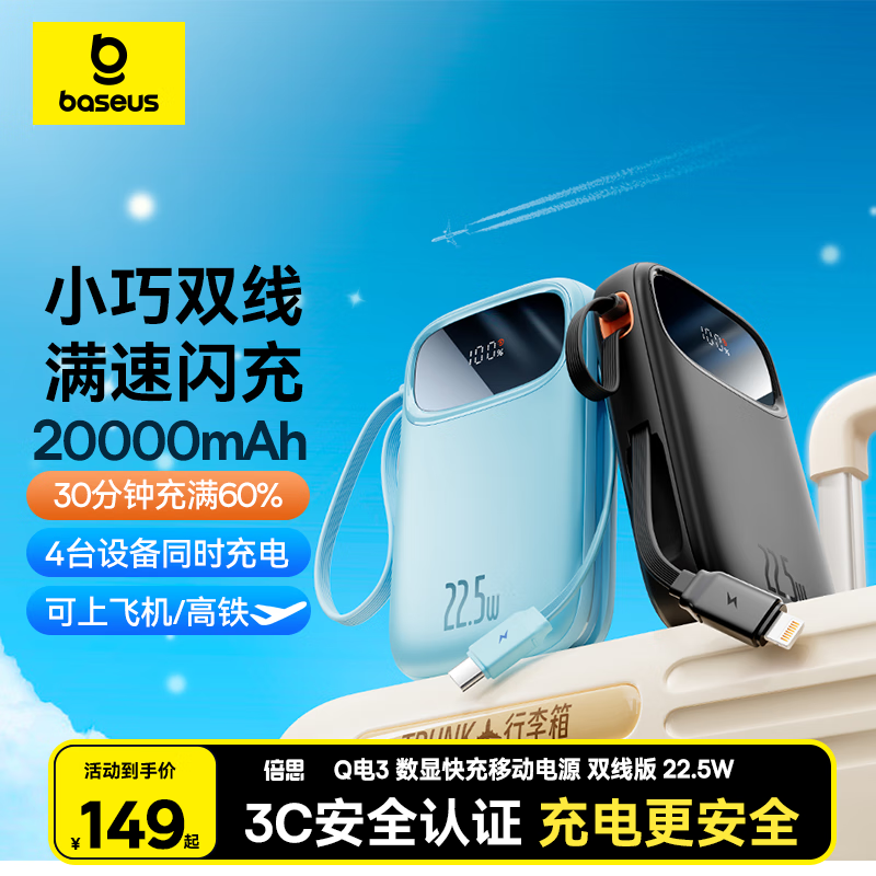 倍思【国标3C认证】充电宝20000毫安自带双线22.5W快充移动电源可上飞机适用于苹果安卓小米手机