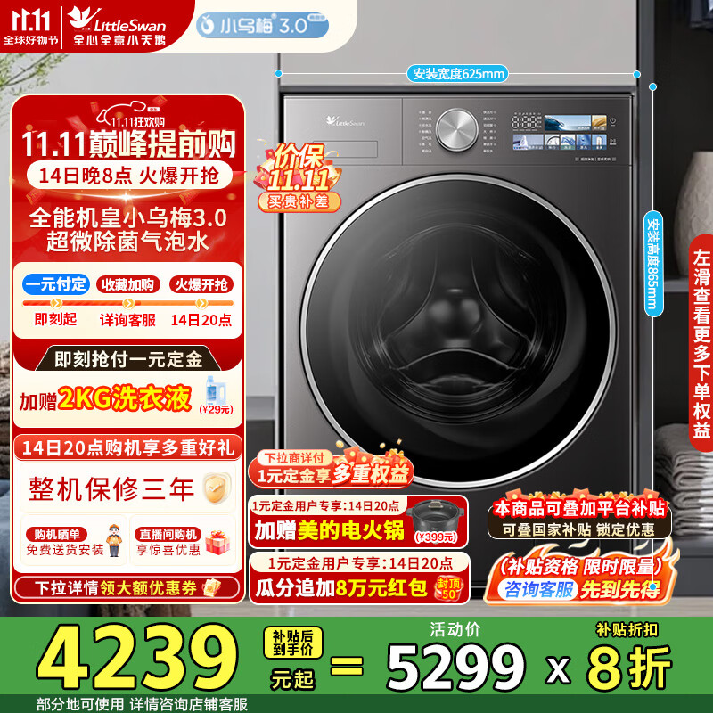 小天鹅(LittleSwan)滚筒洗衣机全自动家用 纯平全嵌【小乌梅3.0】10公斤超薄 一级能效 超微净泡智能变频 国家补贴20% TG10VE40