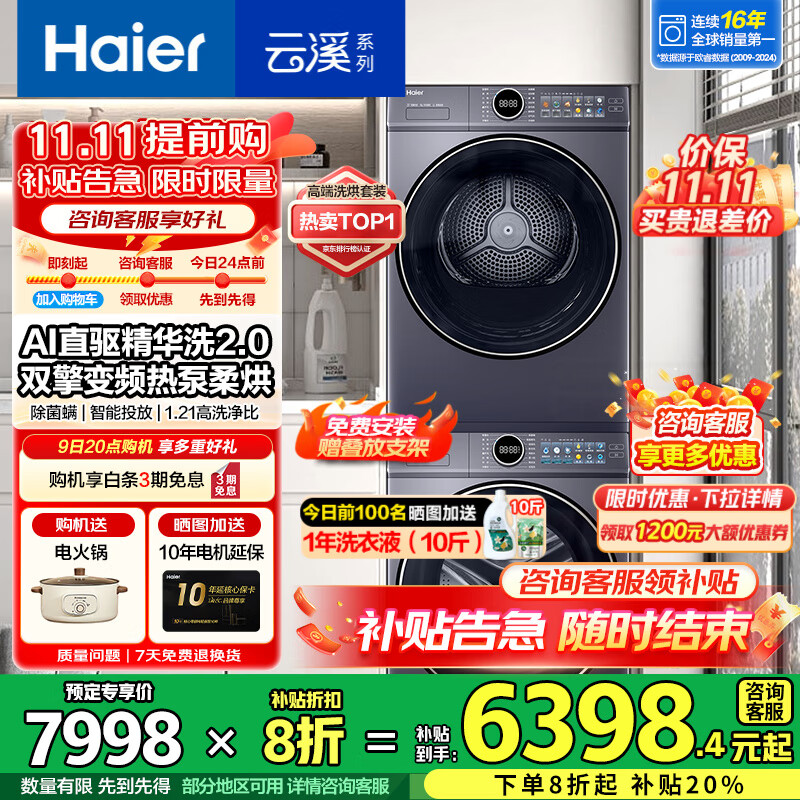 海尔云溪4.0系列77E/98/576/洗烘套装回南天除潮除螨家用超薄洗衣机热泵烘干机组合 77E直驱精华洗双擎热泵+1.21洗净比+羊毛绿标