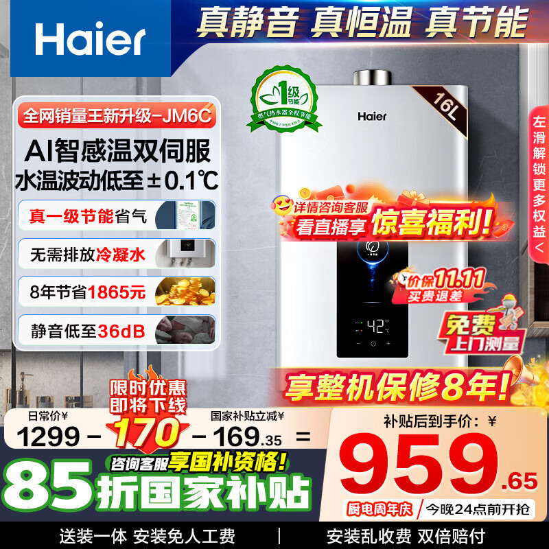 海尔(Haier)燃气热水器【国补立享85折】天然气一级节能省薪水伺服恒温四段微火控温夏天不烫 整机保8年 JM6C 16L 【JM6C整机质保8年】咨询客服享惊喜补贴